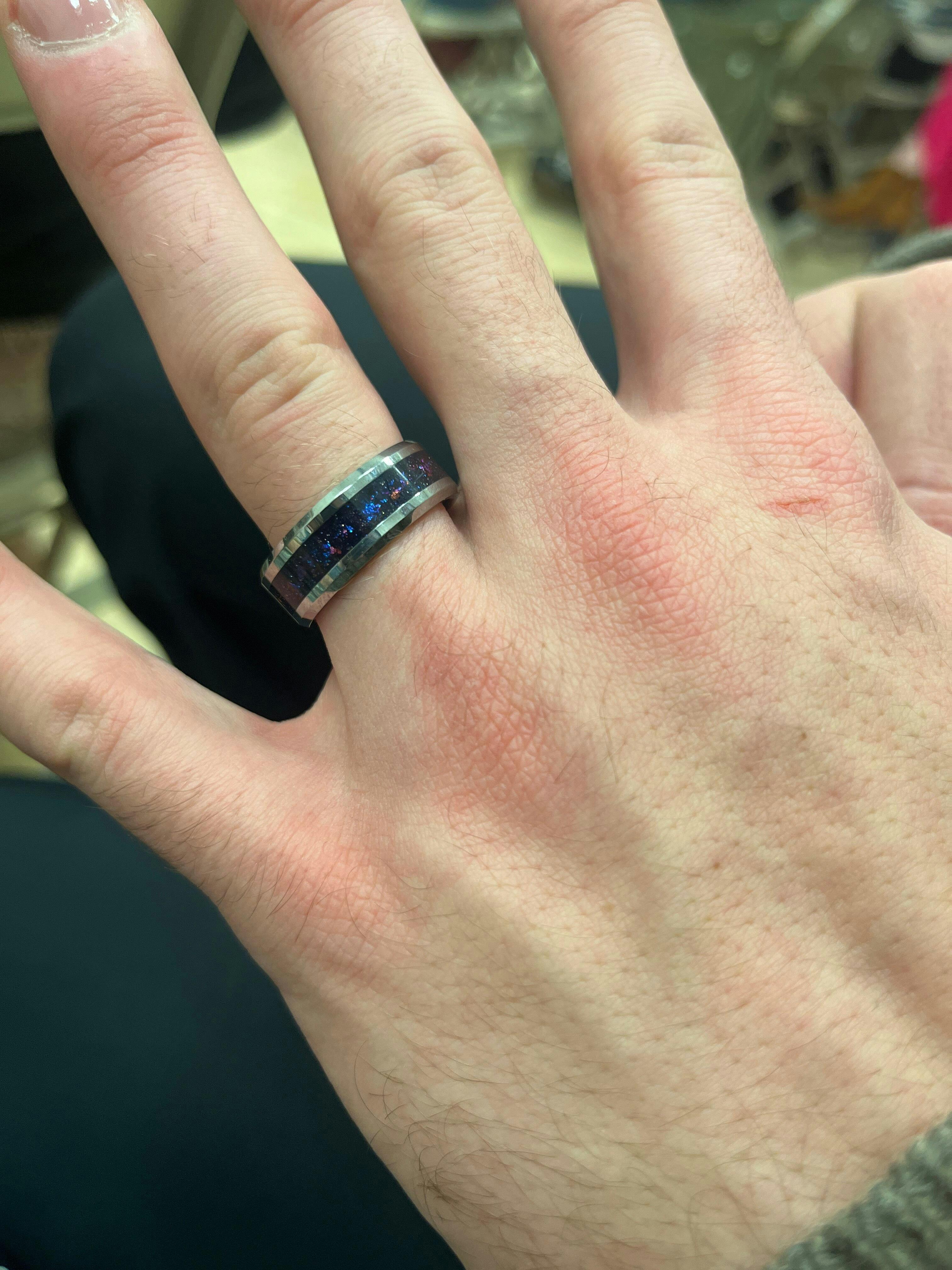 The "Galaxy" his and hers tungsten wedding ring set features a mesmerizing design reminiscent of swirling gas and dust clouds found in galaxies, this ring boasts a stunning array of colors that evoke the celestial splendor of the night sky. Deep blues, purples, pinks, and oranges come together in a breathtakingly beautiful pattern, creating a sense of cosmic movement and dynamism that is sure to captivate the imagination.